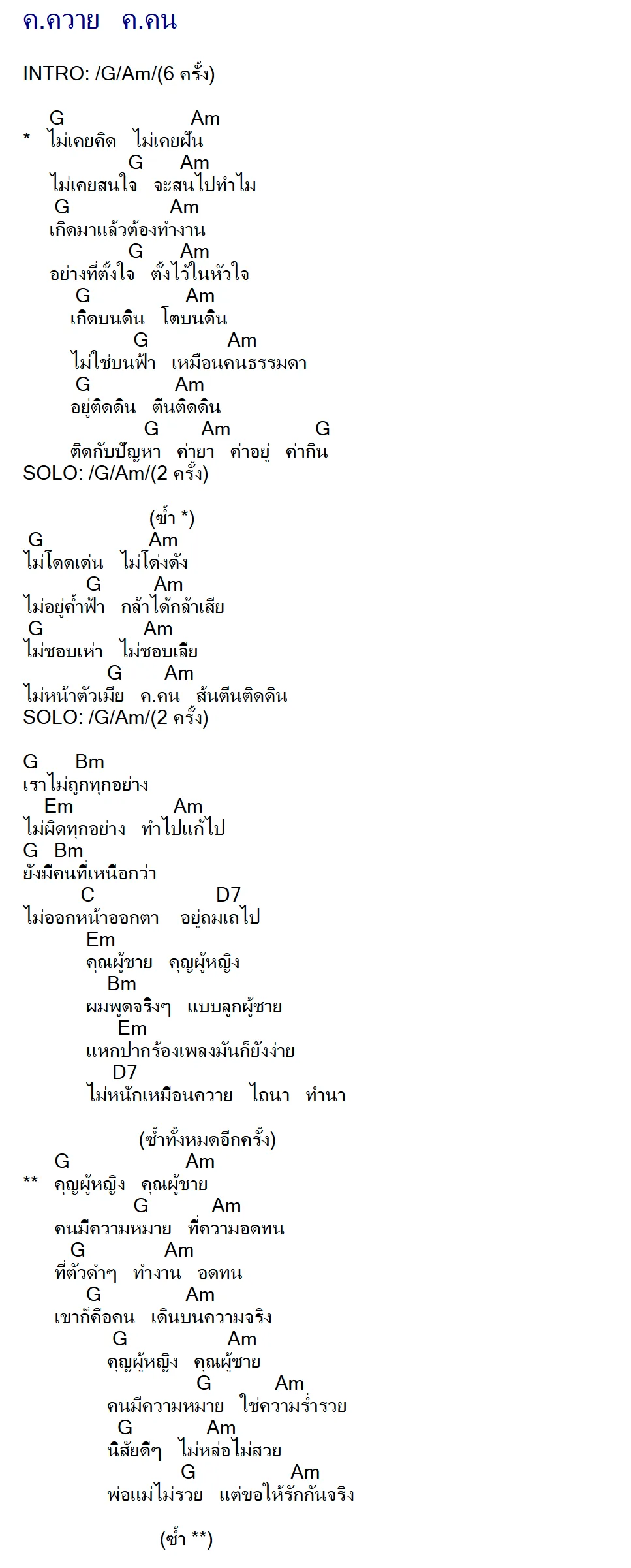 ที่ตัวดำดำทำงานอดทนเขาก็คือคน เดินบนความจริง คุณผู้หญิงคุณผู้ชายคนมีความหมาย ใช่ความร่ำรวย นิสัยดีดีไม่หล่อไม่สวยพ่อแม่ไม่รวย แต่ขอให้รักกันจริง